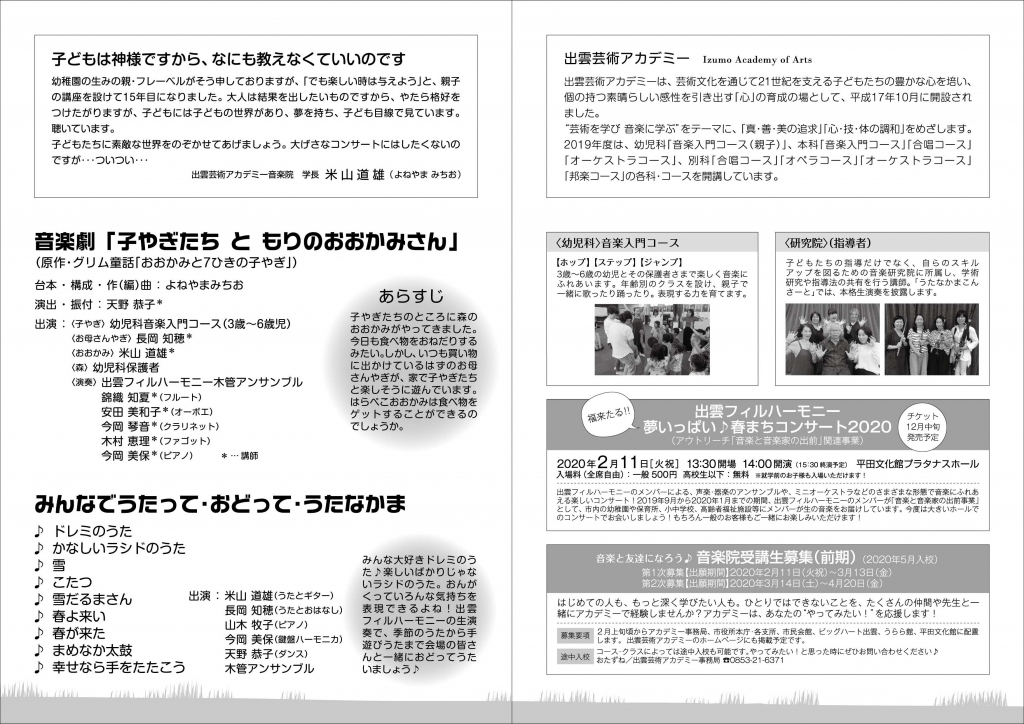 「出雲フィルハーモニー」は今年度も9月から1月の期間で、アウトリーチ事業「音楽と音楽の出前」として、出雲市内の保育所・幼稚園・こども園、小・中学校、高齢者施設等の20か所を直接訪問し、身近な空間で音楽のすばらしさを提供。春まちコンサートではその「出雲フィルハーモニー」のメンバーが勢ぞろいし、各種アンサンブル(弦楽器・金管楽器・木管楽器・打楽器など)、ミニオーケストラを上演する。