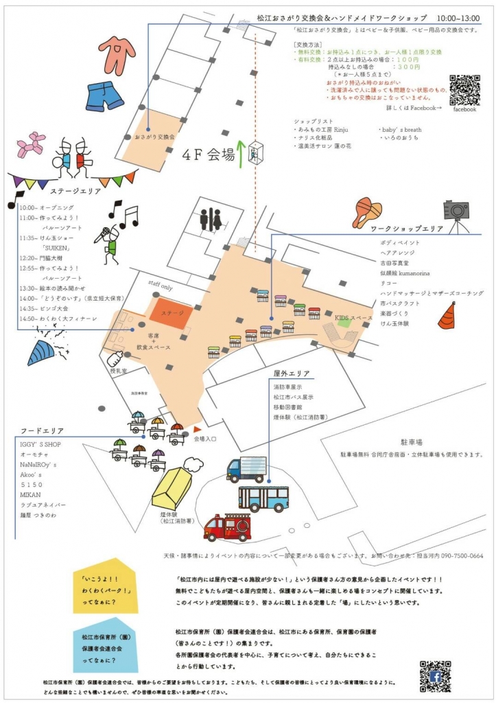 子どもたちが遊べる屋内空間と保護者も一緒に楽しめる場を提供しようと始まったファミリー向けイベント。島根県立短大の保育学生による創作劇や絵本の読み聞かせ、ビンゴ大会などが楽しめるステージイベント、ボディペイントや市バスクラフト、ハンドメイドが体験できるワークショップ、ベビー服・用品の交換会、屋外では消防車や市バスの展示にフードブースなど、親子で1日中楽しめるプログラムが満載だ。