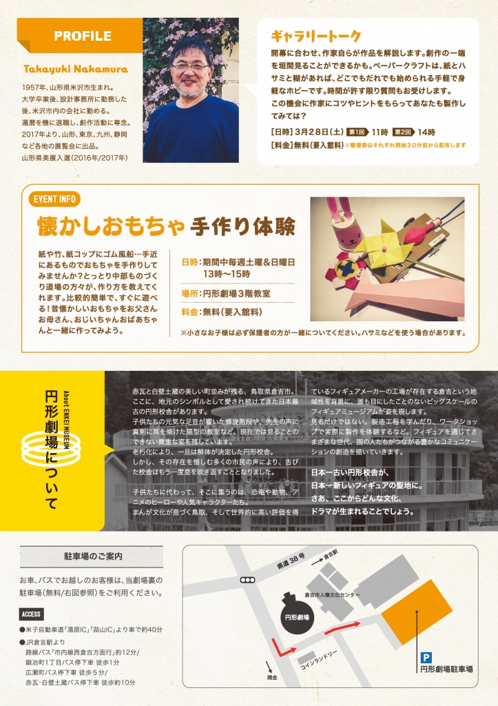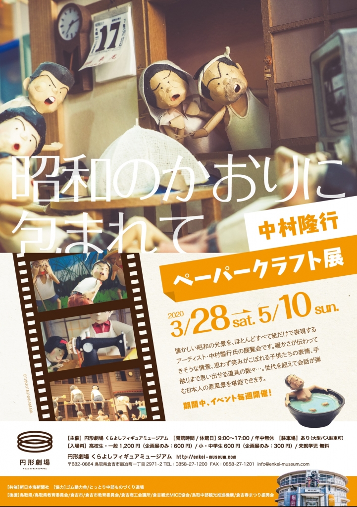 懐かしい昭和の光景を、ほとんどすべて紙だけで表現するアーティスト・中村隆行氏の展覧会。暖かさが伝わって来そうな情景、思わず笑みがこぼれる子供たちの表情、手ざわりまで思い出せる道具の数々。世代を超えて会話が弾む日本人の原風景を堪能できる。期間中は作家本人によるギャラリートークや懐かしおもちゃの手作り体験など関連イベントも充実。