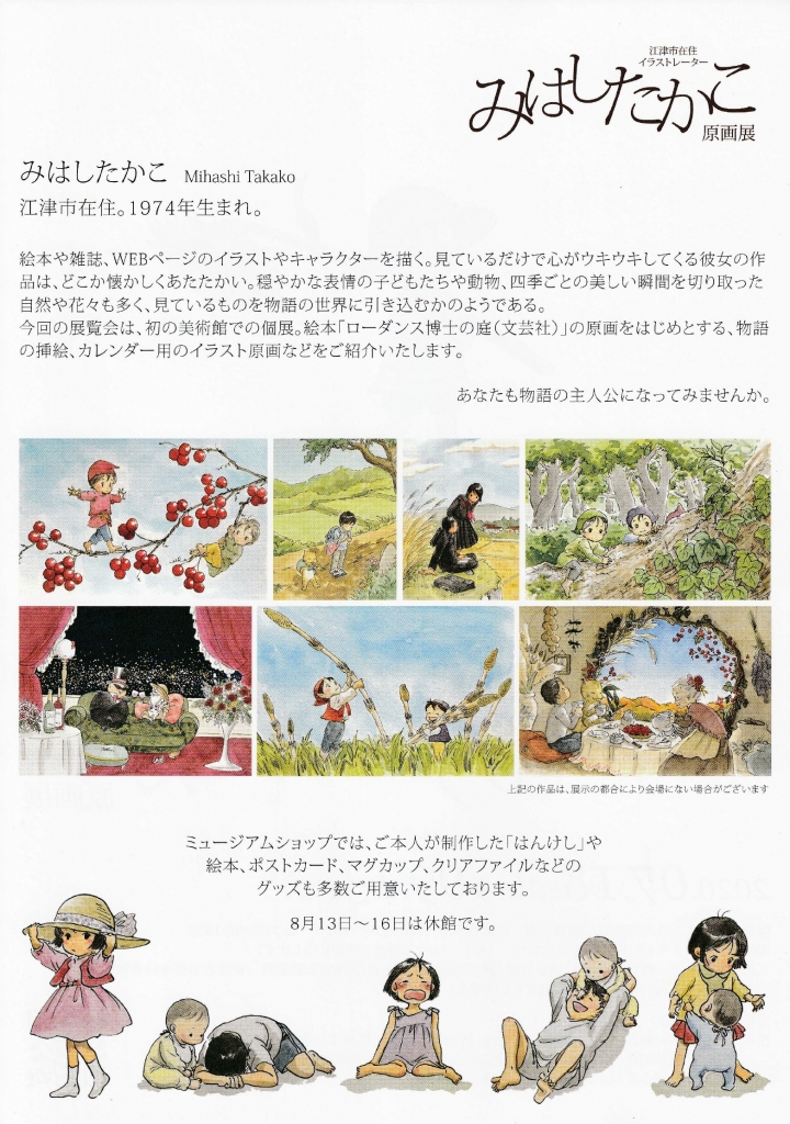 絵本やWEBなどのイラストやキャラクターを描く島根県江津市在住のイラストレーター、みはしたかこさんの原画展。穏やかな表情の子どもたちや動物、四季ごとの美しい自然や花々をモチーフにした作品の数々は、どこか懐かしくて温かく、見ているものを物語の世界に引き込むかのよう。美術館での初の個展となる今回は、絵本「ローダンス博士の庭(文芸社)」の原画をはじめとする物語の挿絵、カレンダー用のイラスト原画などを紹介する。