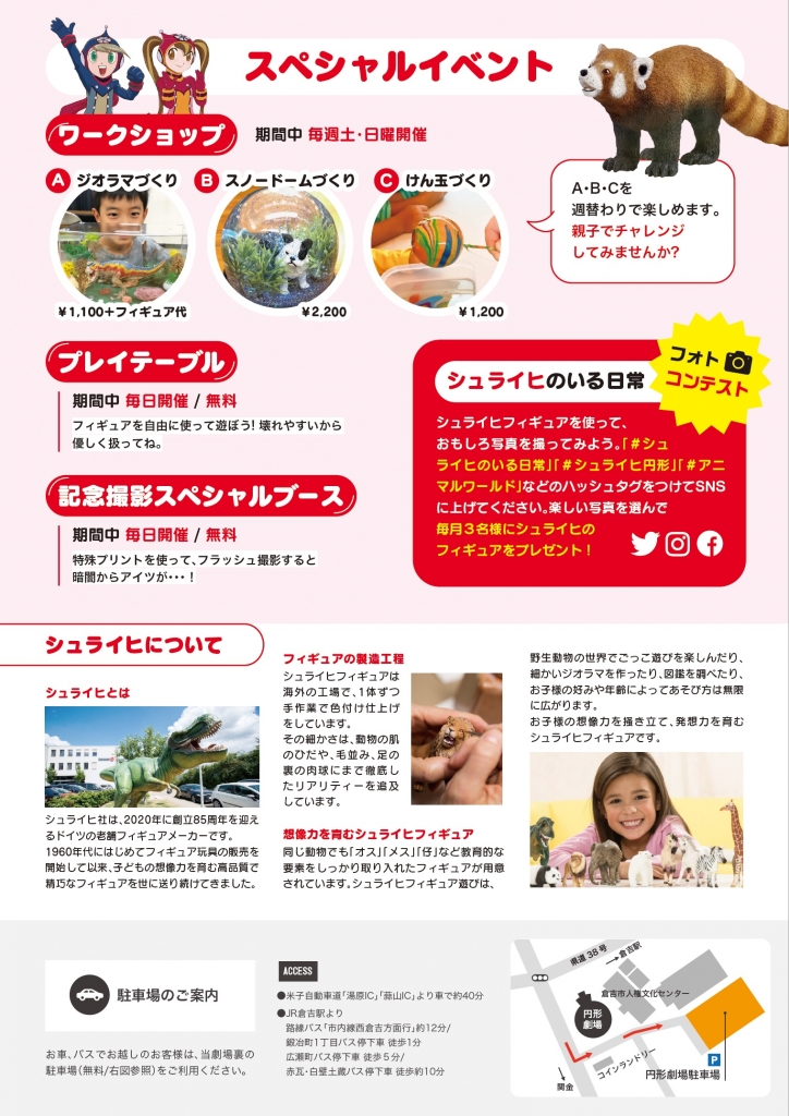 ドイツの老舗フィギュアメーカー『シュライヒ』のフィギュアが一堂に集結。動物、恐竜、ペガサスなど親子で楽しめる。超特大のジャイアントアニマルも数体お目見え。展示だけでなく、さわって遊べるプレイテーブル、特殊フィルムを使った撮影コーナー、週末にはジオラマ作りなどが体験できるワークショップも開催。入館者全員に記念品がもらえるうれしい特典も。