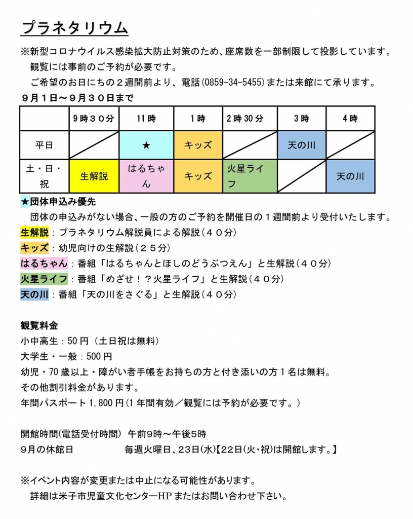 | 備考 | 休み:火曜(9/22は開館)、9/23 その他:新型コロナウイルス感染拡大防止対策のため、座席数の一部制限を実施。内容の変更または中止になる場合あり。詳細はHP等にて確認 |
