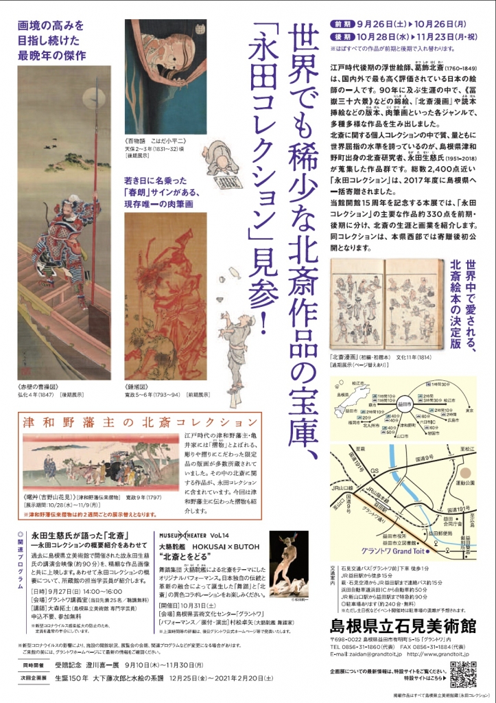 開催中の企画展「北斎-永田コレクション名品展」の関連イベント。永田コレクションを蒐集した島根県出身の北斎研究者・故永田生慈氏が、過去に島根県立美術館で行った講演会映像を精細な作品画像とともに上映。あわせて永田コレクションの概要について、所蔵館の担当学芸員が紹介する。