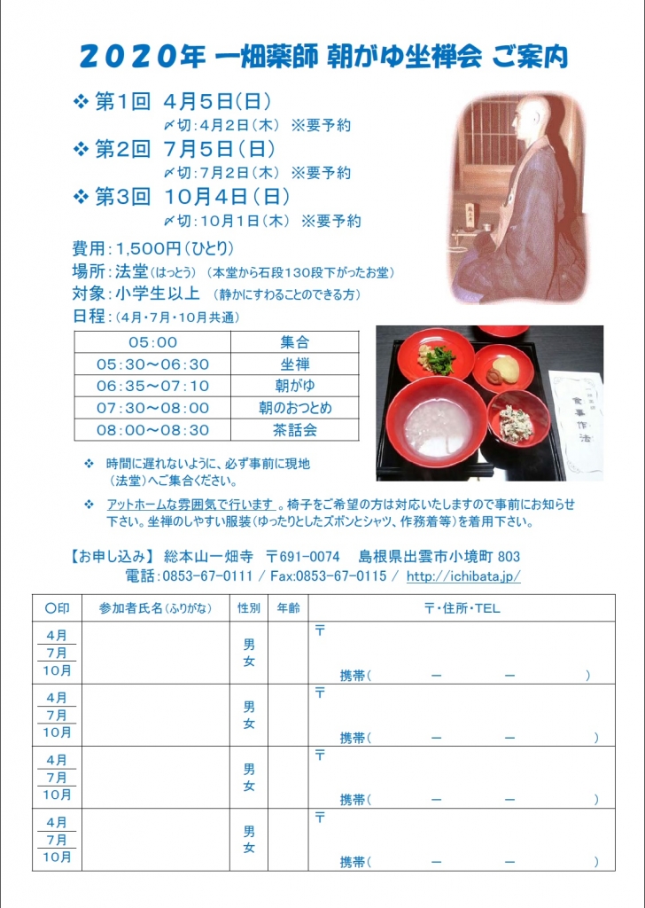 一畑薬師で年に3回開催される坐禅会。初めに読経、坐禅をした後、禅寺の朝がゆが提供される。食事の前に祈りを捧げて「いただきます」の心を学ぶ。