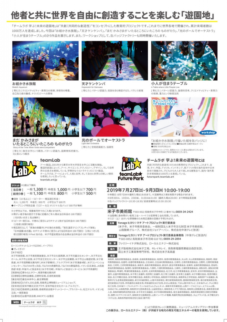 世界各地で開催され、人気を博しているデジタルアートの教育的プロジェクトが山陰初開催。「お絵かき水族館」や「光のボールでオーケストラ」など5作品を紹介する。お絵かき水族館で描いた絵を缶バッジにできるワークショップ(500円)も会期中毎日開催。