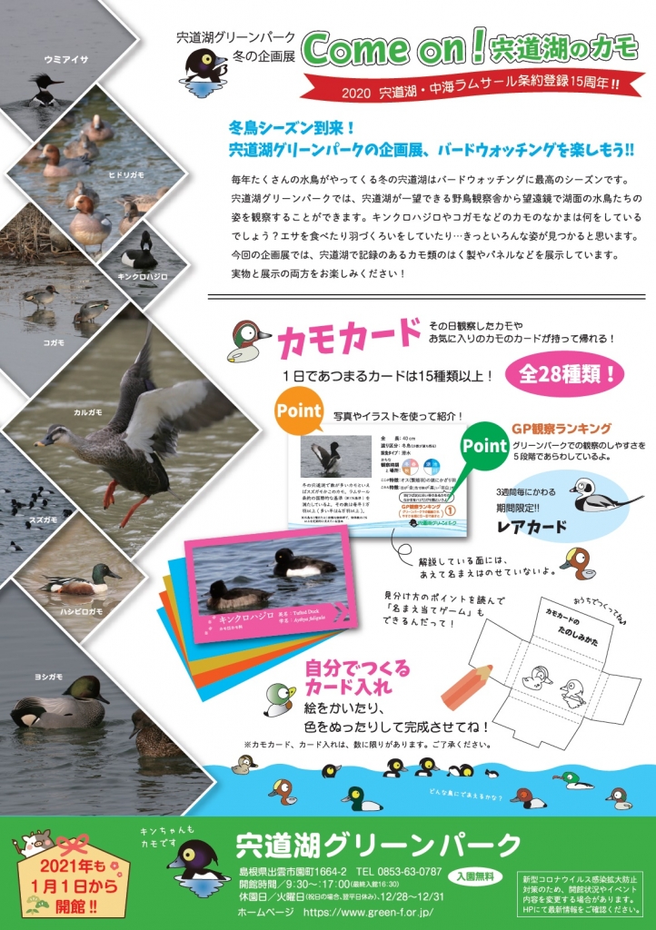 また、宍道湖で観察されたカモ28種を紹介した「カモカード」もプレゼント。期間限定のレアカードもあるので集めてみよう。