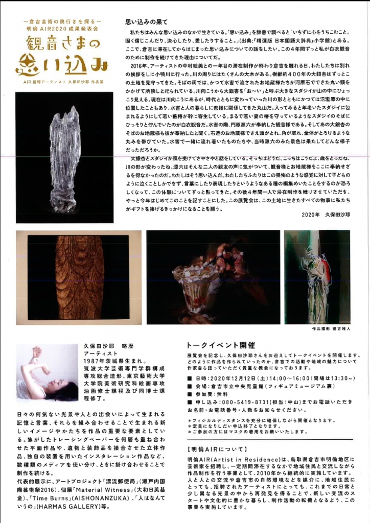 鳥取県倉吉市に滞在して4年目になるアーティスト・久保田沙耶さんが、倉吉での創作活動の中で得た経験などをもとに制作した作品の数々を紹介する展覧会。