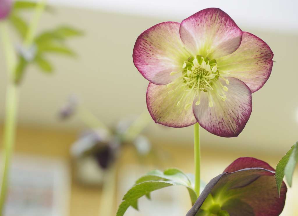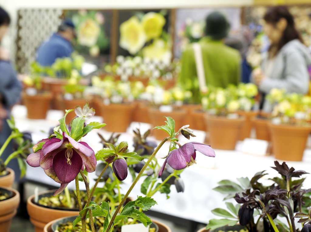 うつむき加減に咲く控えめな姿と、シックな色合いのクリスマスローズの原種約20種を含む約200鉢を展示。
