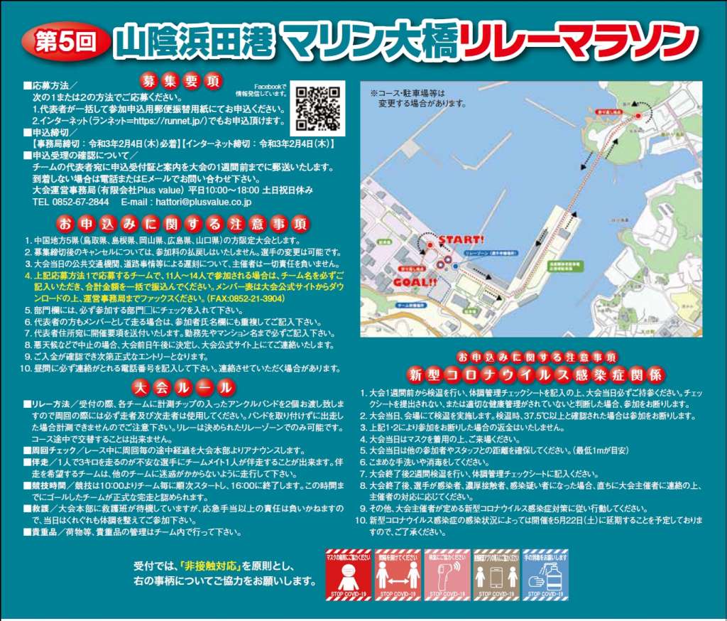 | お問い合わせ | 【大会について】山陰浜田港マリン大橋リレーマラソン実行委員会(浜田市役所観光交流課内)【申込受付について】有限会社Plus value |