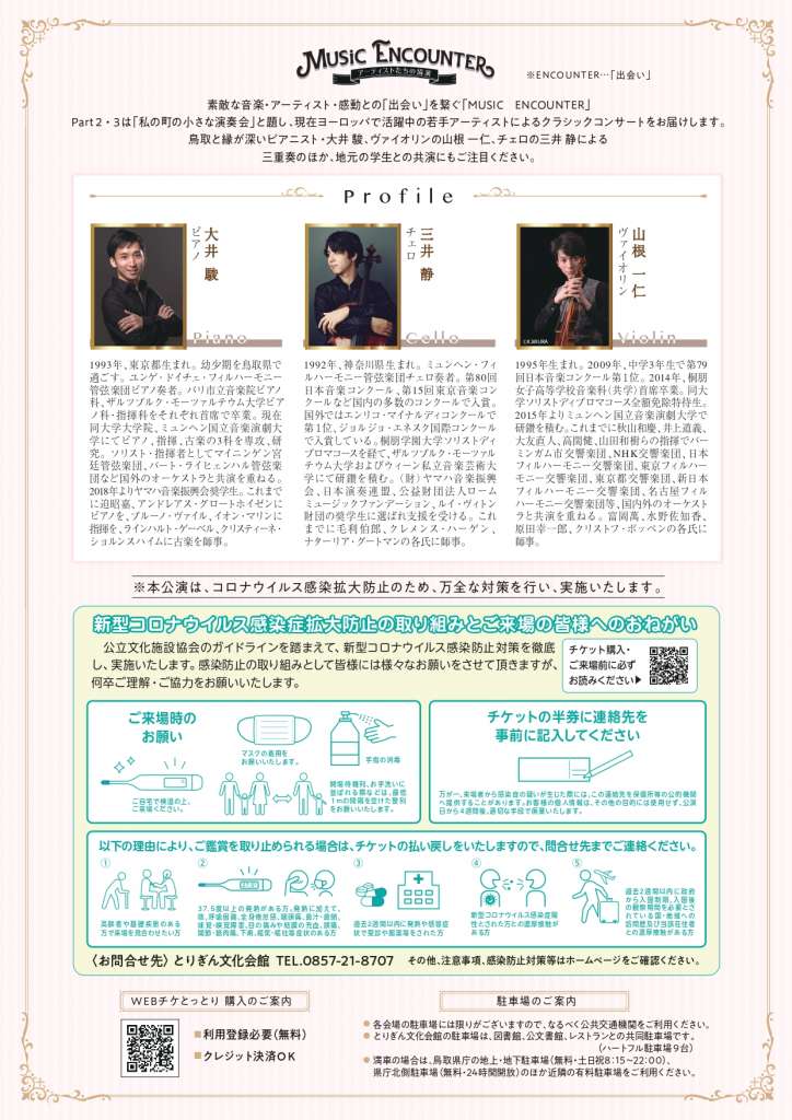 鳥取と縁が深いピアニスト・大井 駿、ヴァイオリンの山根 一仁、チェロの三井 静による三重奏のほか地元の学生との共演にもぜひ注目を。