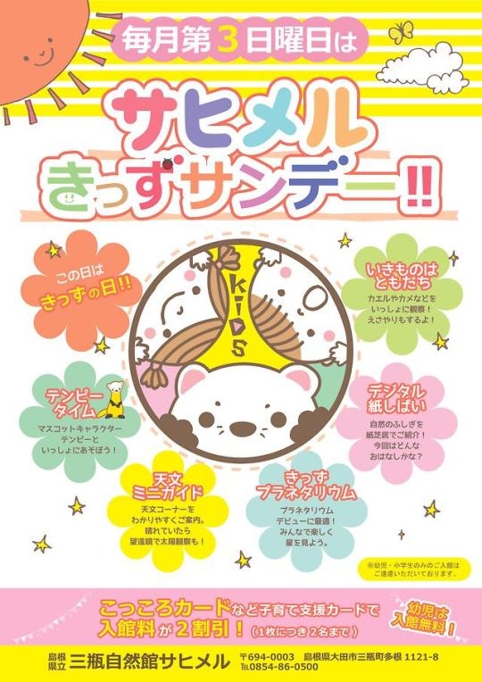 子どもを対象に毎月第3日曜日に開催されている恒例イベント。自然の不思議について紹介するデジタル紙芝居や、きっずプラネタリウム、マスコットキャラクター「テンピー」とふれ合えるなど、親子で楽しい週末が過ごせる内容が盛りだくさん。