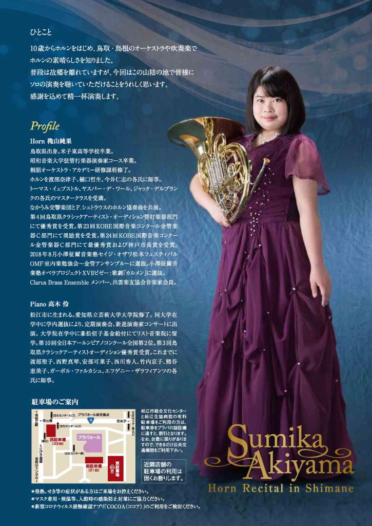 ピアノ共演は高木伶。曲目はサン=サーンスの「演奏会用小品」、ビュッセルの「聖ユベールの狩り」など。