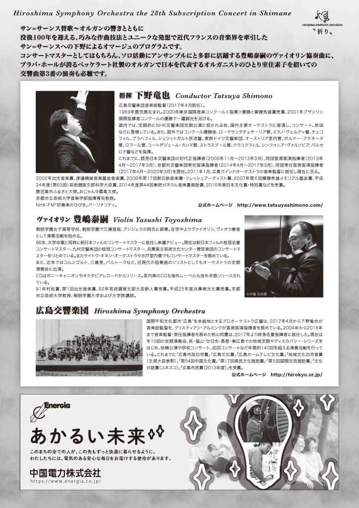 コンサートマスターとしてはもちろん、ソロ活動にアンサンブルにと多彩に活躍する豊嶋泰嗣のヴァイオリン協奏曲に、プラバホールが誇るベッケラート社製のオルガンで日本を代表するオルガニストのひとり、室住素子を招いての交響曲第3番の演奏も必聴。