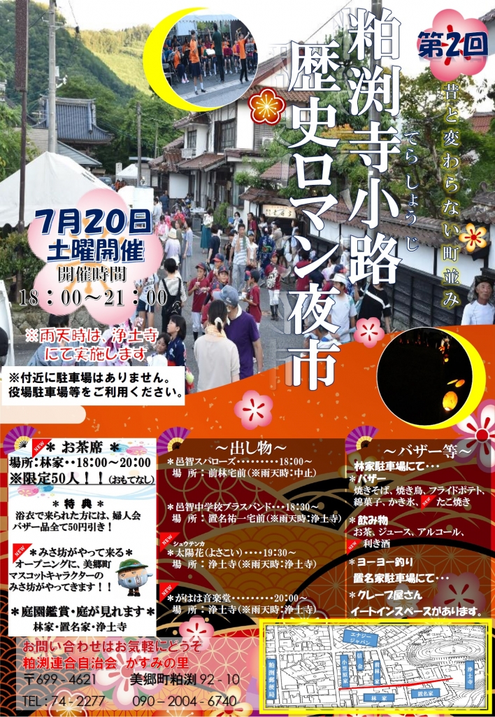 銀山街道で栄えた昔の風景を今も残す粕渕寺小路通りで、2回目となる夜市を開催。焼きそばやかき氷、ヨーヨー釣りといった夜店をはじめ、邑智中ブラスバンド部などによる出し物で、風情残る通りを盛り上げる企画が目白押し。浴衣で参加した人にはうれしい特典も。