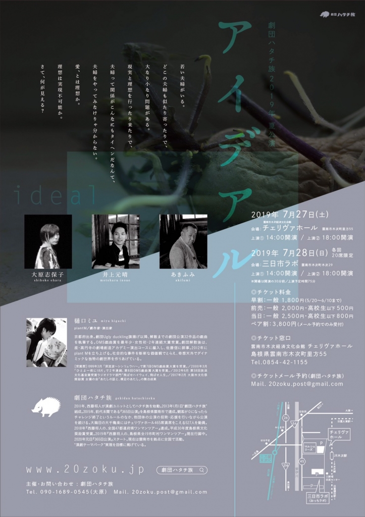 島根県雲南市を拠点に活動している劇団の夏公演。どこの夫婦も似たり寄ったりで、大なり小なり問題がある。夫婦をやってみて初めて分かる大変さ。愛とは理想か、理想は実現不可能か。若き夫婦の物語を通して、何が見えてくるのか?