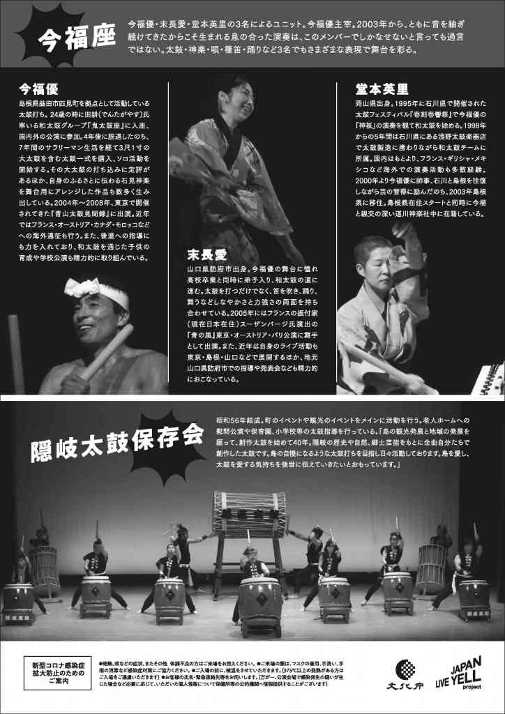 今福優・末長愛・堂本英里の3名によるユニット「今福座」による和太鼓公演。