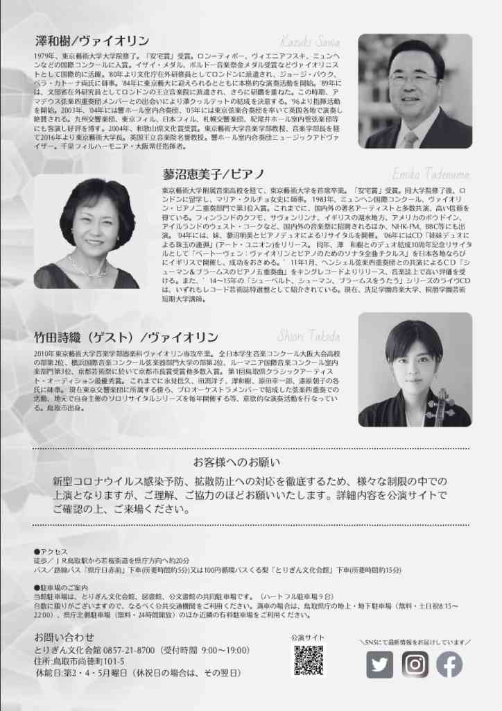 結成45周年を迎え、深い音楽性と美しい音色を兼ね備え円熟を極めるハーモニーで評価の高い、ヴァイオリニスト・澤和樹氏とピアニスト・蓼沼恵美子氏のデュオに、鳥取市出身で東京交響楽団およびとっとりチェンバーオーケストラのメンバーとして活躍している竹田詩織氏をゲストに迎える。