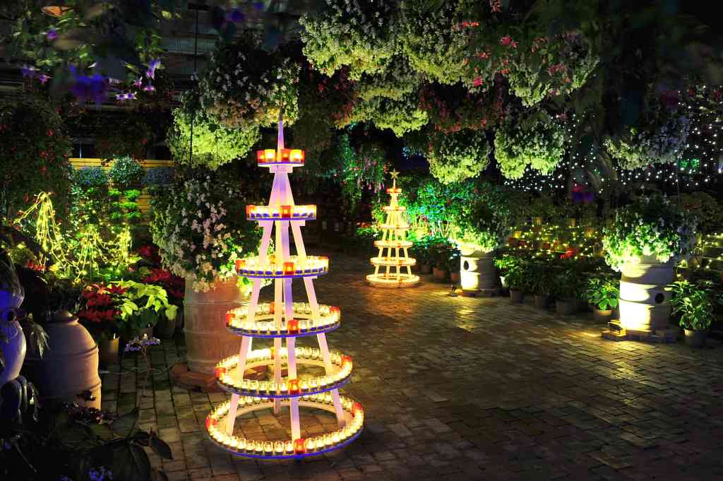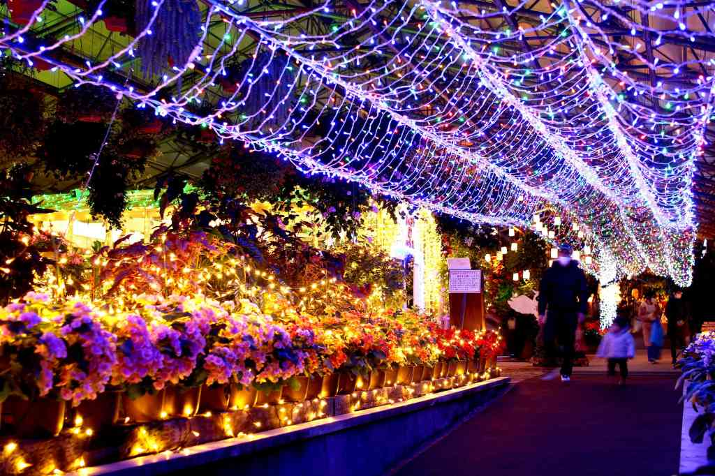 毎年恒例の冬のイルミネーションイベント。夜の園内はイルミネーションの輝きで雰囲気が一変し、「花と鳥と光の楽園」に変わる。