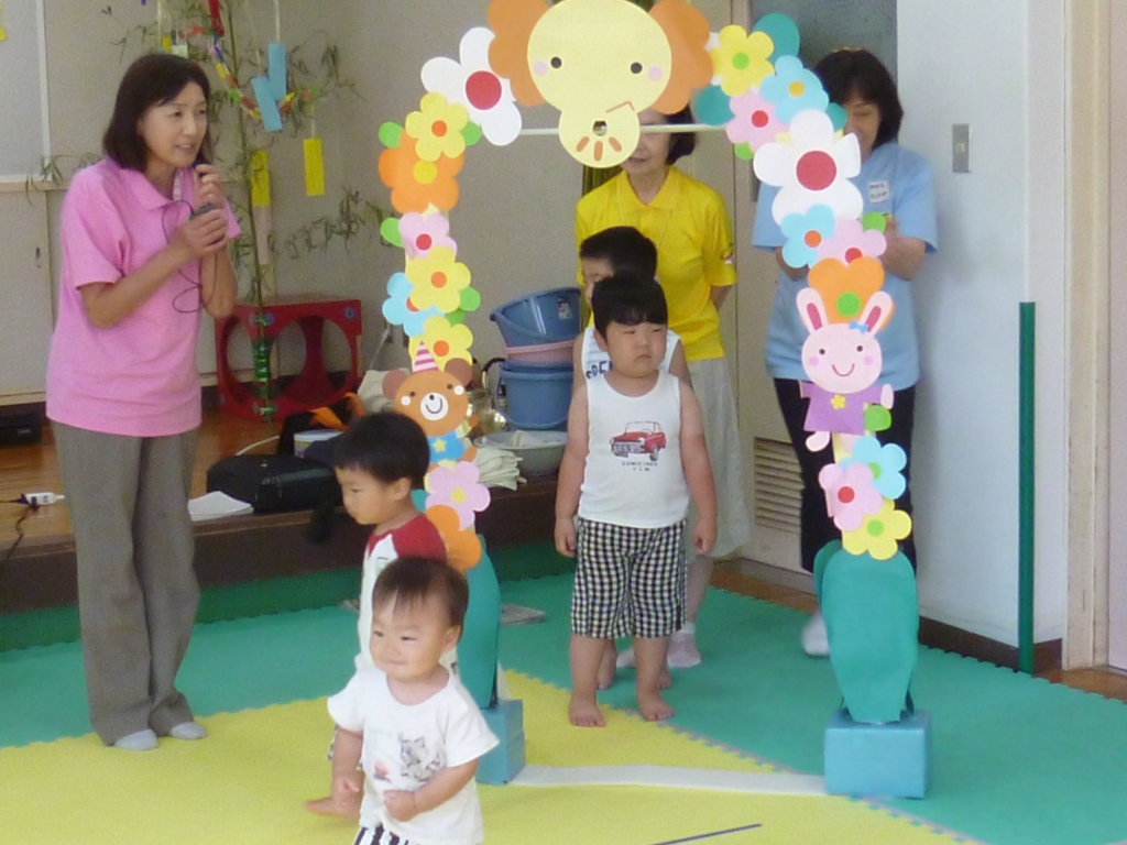 7月生まれの誕生会と、親子歯みがき教室を開催。体操や歌、親子ふれあい遊びの後、7月生まれの誕生会をしてみんなでお祝い。その後、保健師や歯科衛生士を講師に、虫歯チェックや、DVDにて歯磨きの仕方や虫歯予防についてみんなで学ぶ。