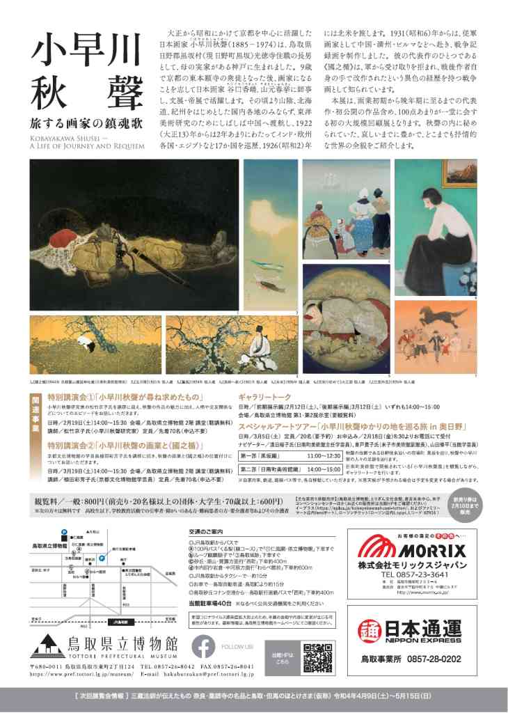 本展では、個人コレクションを中心に、小早川秋聲の代表作をはじめとした初期から晩年にいたる日本画約100点あまりと、資料から時代を切り取りつつ、その画業の全貌を紹介する。
