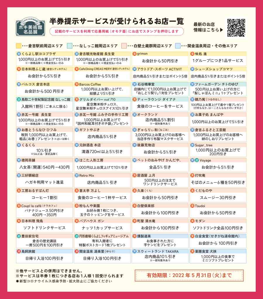 倉吉博物館で5/8まで開催中の「ホキ美術館名品展」との倉吉周遊コラボ企画。参加店舗で展覧会の半券を見せてお得なサービスやプレゼントがもらえる「半券提示サービス」と、3店舗分のスタンプを集め先着や抽選でプレゼントが当たる「周遊スタンプラリー」を実施。