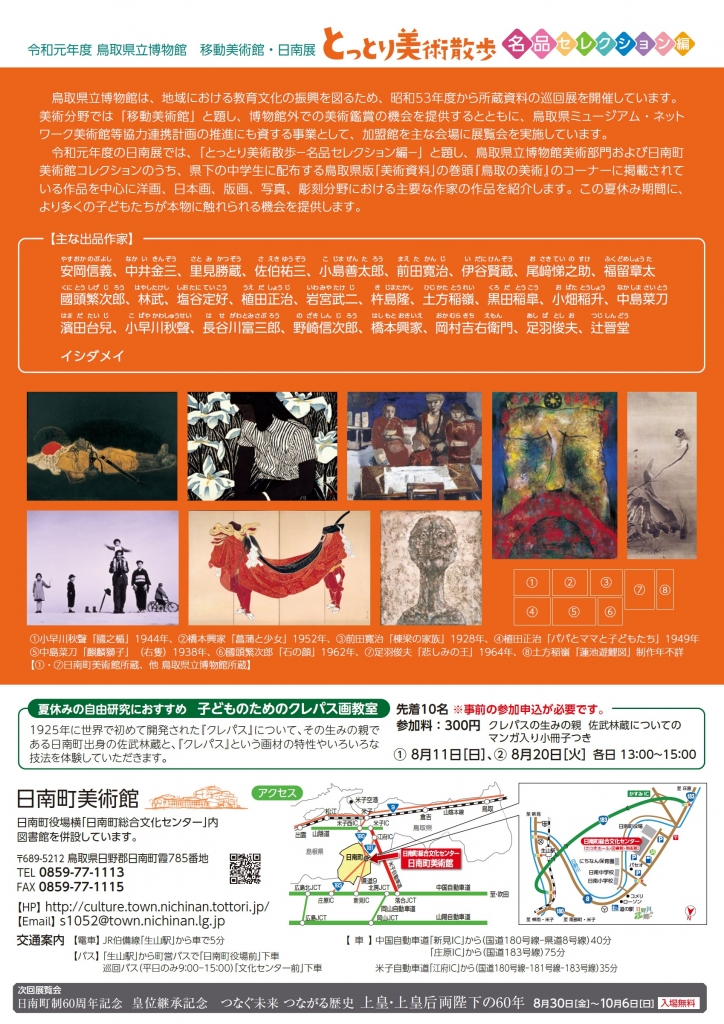 所蔵品の中から洋画、日本画、彫刻などの選りすぐりの作品を紹介。 日本を代表する洋画家前田寛治の代表作「棟梁の家族」をはじめ、日本の写真史に名を刻む塩谷定好、植田正治の名作、また日本画家小早川秋聲の代表作「國之楯」など、鳥取ゆかりの作家の名品を展示する。