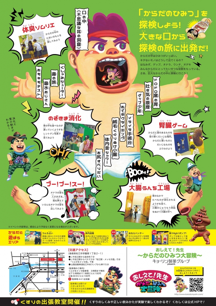 体の秘密を楽しく学べるイベントが山陰初上陸。イベントでは全長40mの人体バルーンが登場し、バルーンの口から入って、お尻から出ることで、体の仕組みを楽しく学べる。ハナミズ、ゲップ、オナラ、ウンチ、オデキなど、汚いものはどうして出てくるのか、そういった体に関する疑問を体感できるので、夏休みの自由研究のテーマにもピッタリ!