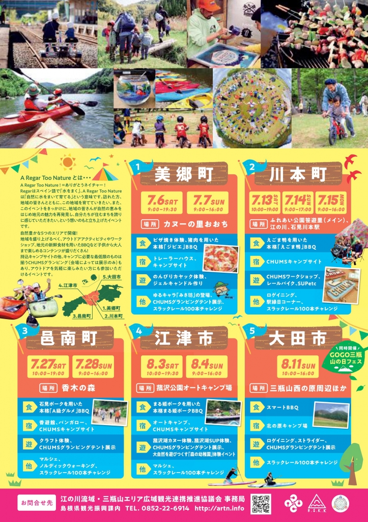 島根県の江の川流域と三瓶山エリアの自然豊かな江津市・川本町・美郷町・邑南町・大田市の計5市町で、自然を楽しむアドベンチャーイベントを開催。「A Regar Too Nature(=ありがとうネイチャー)」の「Regar」はスペイン語で「水をまく」、「A Regar Too Nature」は「自然に水をまいて育てる」の意味。来訪者も、地域住民も一緒に各地域を育てていきたい。そして、今回のイベントによって地域の人たちが自然の恵みをはじめ、地元の魅力を再発見し、自分たちが住む町に誇りを感じてほしいとの思いで企画された。
