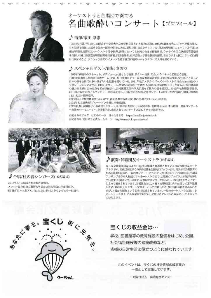 家田厚志氏の指揮のもと「N響団友オーケストラ」の演奏と「杜の音シンガーズ」の合唱、そして、スペシャルゲストの由紀さおりさんの歌声を交えて、名曲を情緒感たっぷり楽しめる。