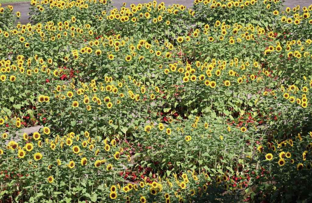 真夏の下、まばゆく輝く丘一面のマリーゴールドが久々登場!約30品種の個性的なヒマワリや、水上花壇では約3000株のヒマワリで作るヒマワリ迷路も楽しめる♪