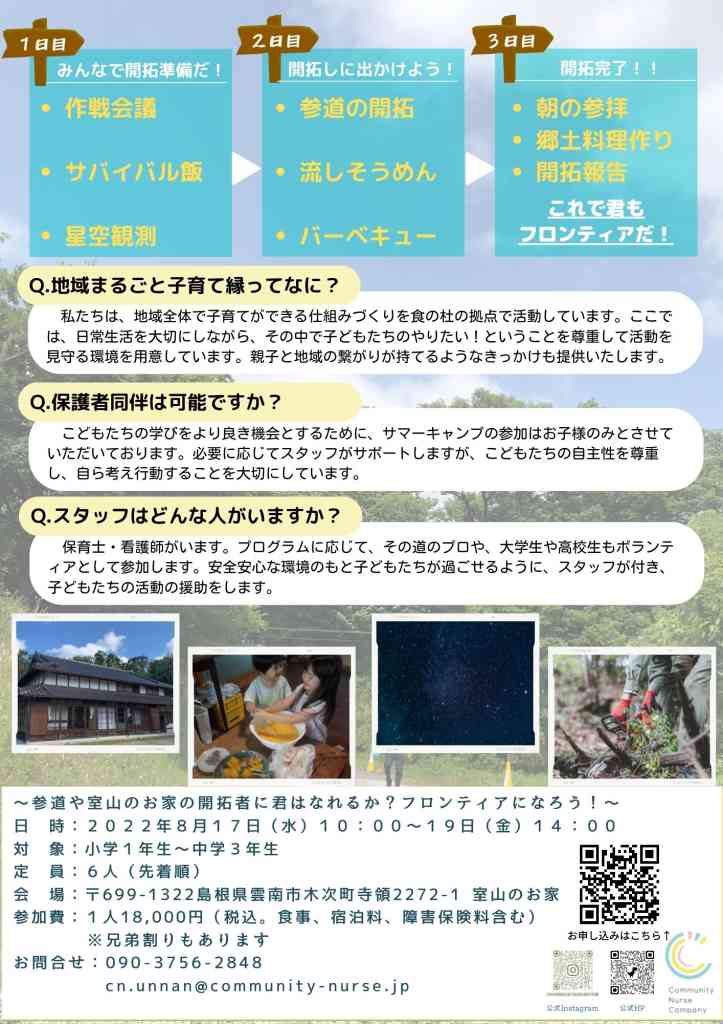 | 料金 | 参加1人1万8000円※要事前申込。きょうだい割引あり |