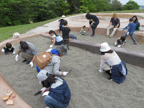 発掘現場を再現した「発掘体感ひろば」で、竪穴住居内に埋まっている土器や土製品などを掘り出す体験型イベント。「はっくつ体験」の記念に出土品一品の持ち帰りができる。