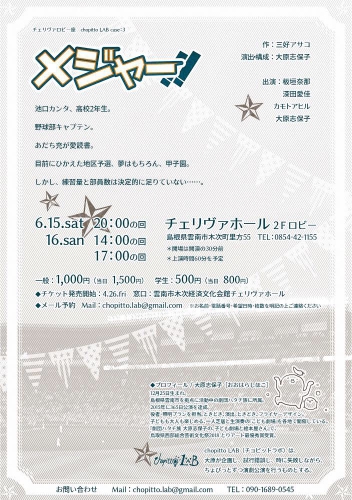 島根県雲南市を拠点に活動中の劇団ハタチ族のメンバー・大原志保子さんが演出と構成を手掛ける個人企画シリーズの第3弾。今回は「あだち充」が愛読書の野球部キャプテンを中心に、部室内で繰り広げられるシチュエーションコメディに挑む。