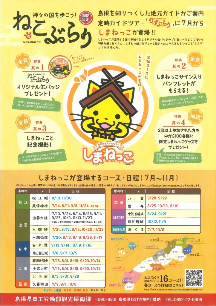 美保関町の観光スポットをベテランガイドが案内する定時ガイドツアー(毎月第2、4日曜開催)に、期間限定で島根県の観光マスコットキャラクター・しまねっこが登場。題して「ねこぶらり」。参加者へは特別な特典が盛りだくさん! 予約不要なので気軽にしまねっこに会いに来て。