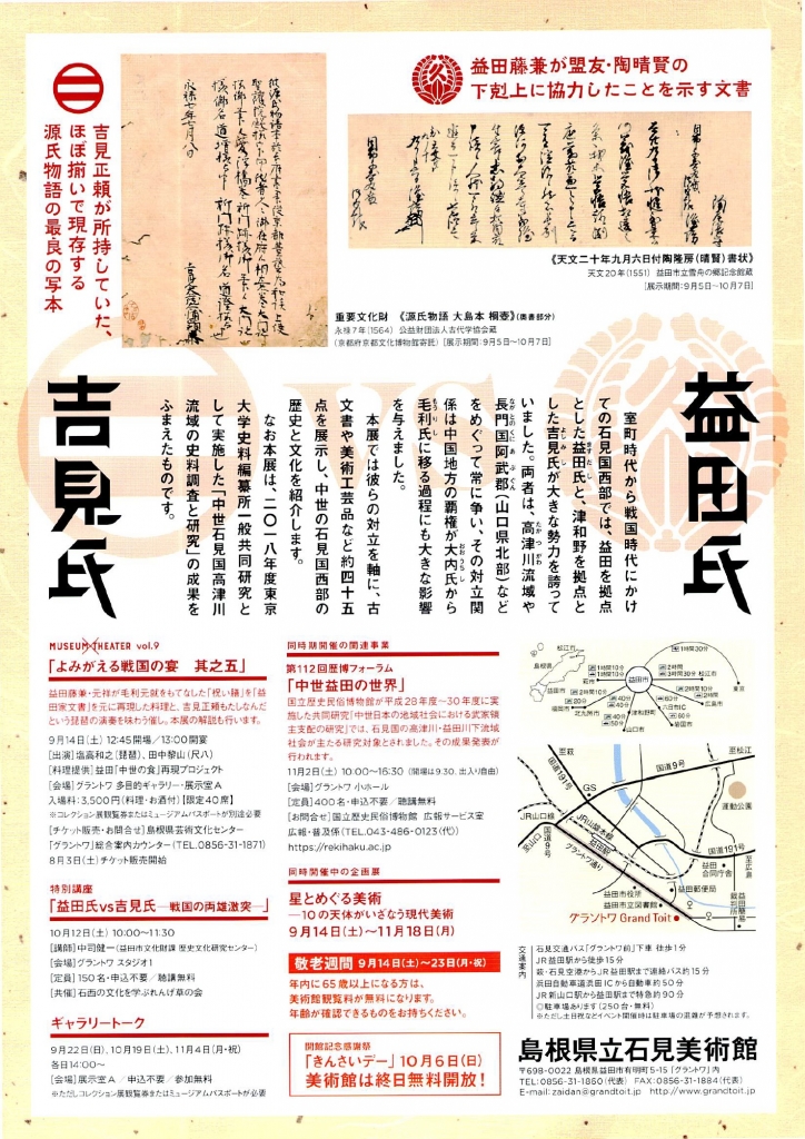 室町時代から戦国時代にかけて、石見国西部、現在の島根県益田市周辺で常に争っていた2大勢力、益田氏と吉見氏の対立を軸に、中世の石見国西部の歴史や文化を紹介する特別展。古文書や美術工芸品など約45点を展示する。期間中、特別講座やギャラリートークなど関連イベントも実施。