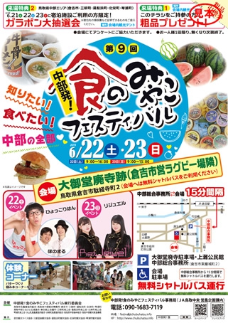 旬のスイカやメロン、鳥取和牛の丸焼きなど、様々な地元グルメが味わえるほか、牛骨ラーメンをはじめとするご当地B級グルメなどのブースも多数登場。特設ステージでは、吉本芸人によるお笑いショーやキャラクターショー、お楽しみ抽選会なども開催される。