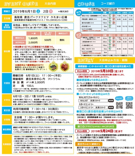 倉吉パークスクエアをスタートし、3~40キロの様々に設定されたコースを歩くウォーキングイベント。名探偵コナンやひなビタ♪をテーマにしたコースのほか、キッズ向けコースなどもある。ゲストにオリンピック金メダリスト・荻原健司氏を迎える。