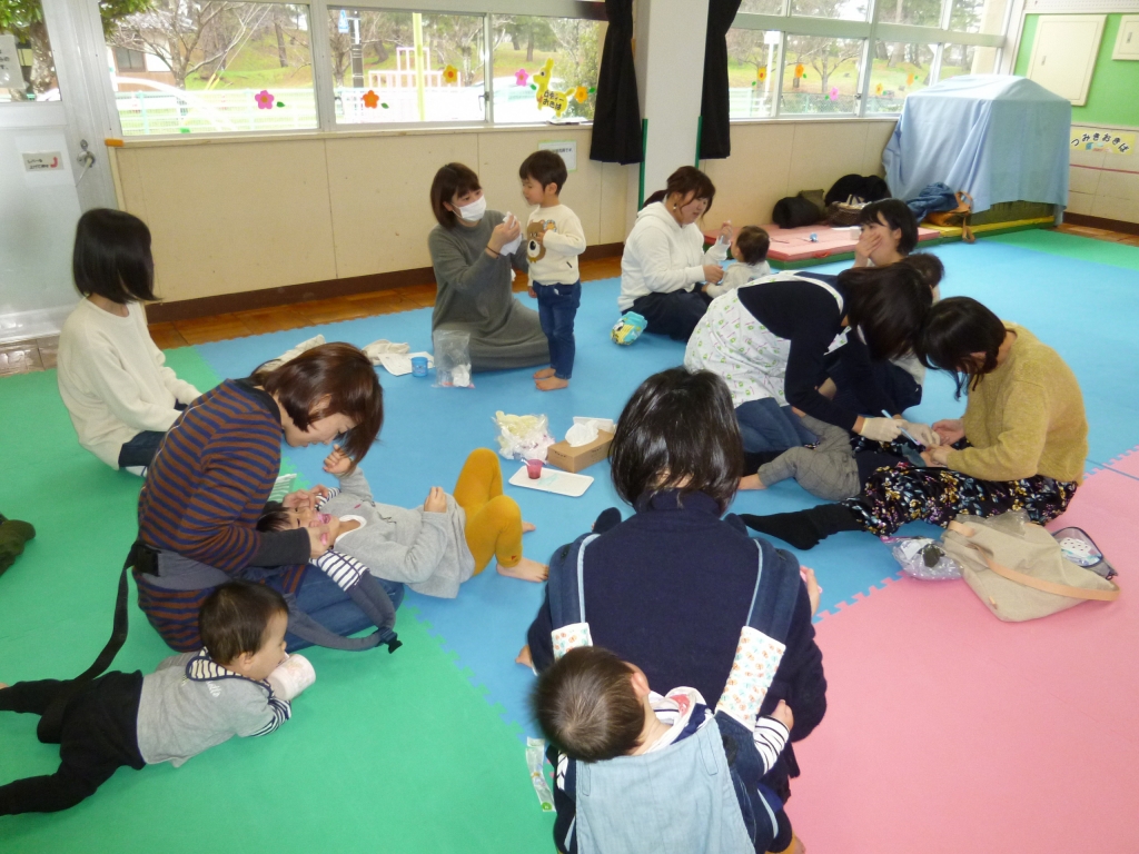 10月生まれの誕生会と、親子歯みがき教室。体操や歌、親子ふれあい遊びの後、10月生まれの誕生会を開催。誕生児以外も参加可能。その後、保健師や歯科衛生士による「親子歯みがき教室」では虫歯チェックや、DVDを見て歯磨きの仕方や虫歯予防についてみんなで学ぶ。