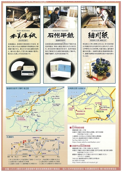 ユネスコ無形文化遺産に「和紙・日本の手漉和紙技術」として登録された「石州半紙(島根県浜田市)」、「本美濃紙(岐阜県美濃市)」、「細川紙(埼玉県小川町・東秩父村)」の3紙。この3つの産地が連携し企画展を開催。伝統の技と原料で漉いた和紙商品の販売と、魅力ある和紙の作品を展示する。