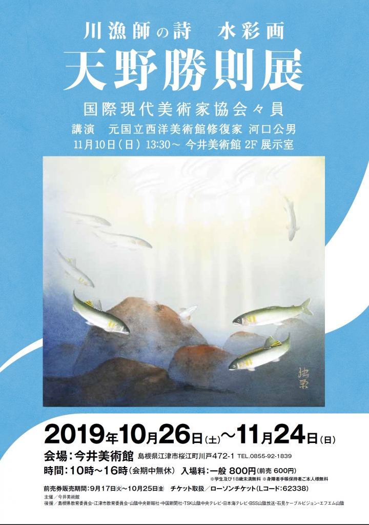 島根県江津市桜江町在住の川漁師、天野勝則氏の水彩画を紹介する展覧会。水中で生き生きと泳ぐアユの姿、月明かりのもとでたたずむ野兎、夜明け近い川面の様子など、長年にわたって江の川で川漁師として生きてきた天野氏ならではの視点で描かれた作品約100点を一堂に展示。