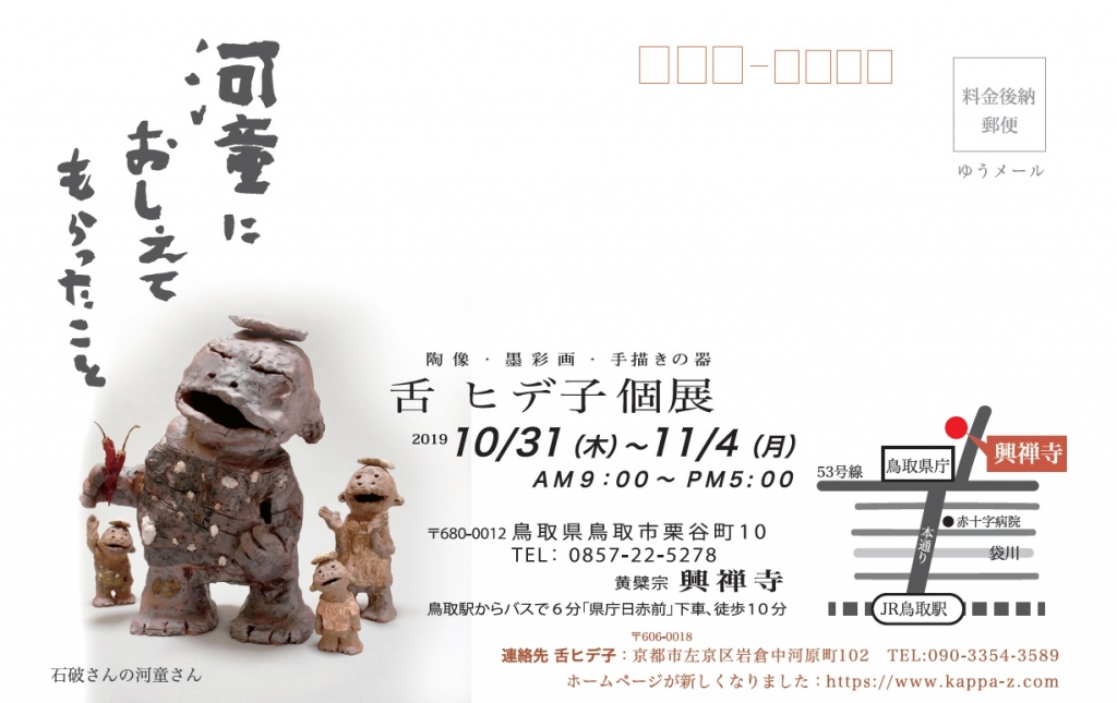 鳥取県八頭町出身で京都市在住のアーティスト、舌ヒデ子さんの陶彫、墨彩画、手書き器を集めた作品展。秋の美しい庭園を鑑賞しながら、ほのぼのとした「河童さん」たちの世界に浸ろう。期間内、京都の抹茶の振る舞いも予定している。