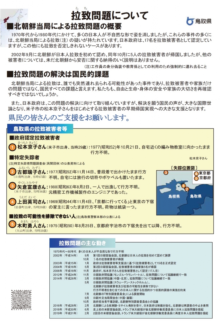 鳥取県米子市出身の松本京子さんをはじめ、すべての拉致被害者の一刻も早い帰国の実現を願い、拉致問題への関心を高め、世論をもって問題の早期解決を図ることを目的に開催。被害者家族である松本孟さんの訴えや、北朝鮮の日本人拉致をスクープした元産経新聞記者の阿部雅美氏による講演などが行われる。