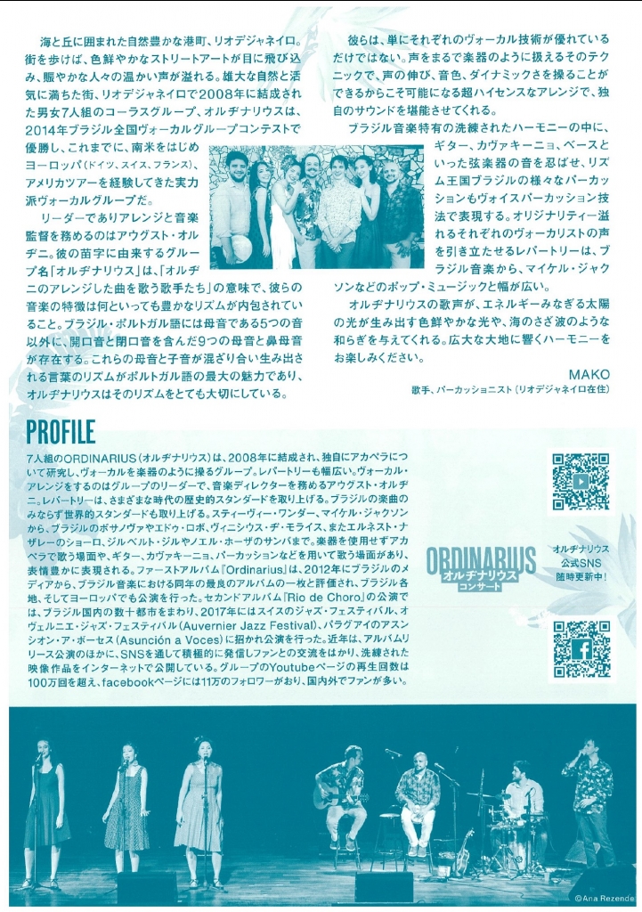ブラジルのヴォーカルグループによるコンサート。アカペラだけでなく、ギターやブラジルの弦楽器・カヴァキーニョ、パーカッションなどを取り入れ、ポップスやボサノヴァ、サンバなどレパートリーも多彩。ノリがいいラテンのリズムと、華やかで心地良いハーモニーで誰もが楽しめるステージだ。