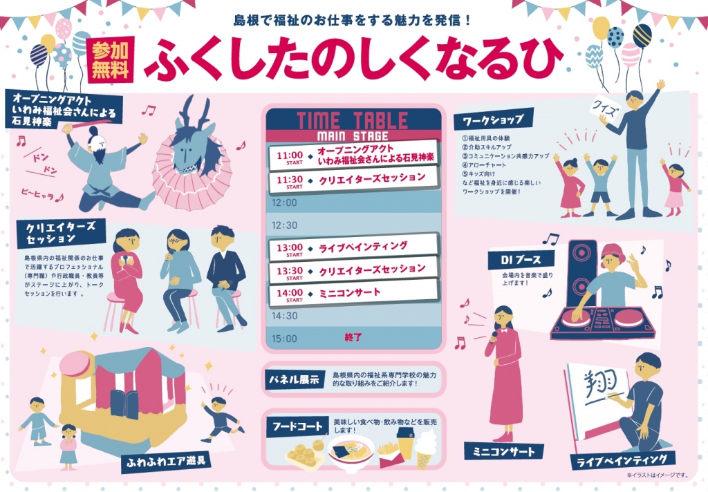 福祉・介護の仕事をPRするイベント。福祉・介護の現場で活躍するプロフェッショナルとの交流や、福祉用具体験などのワークショップ、福祉系専門学校の紹介を通じ、島根で福祉のお仕事をする魅力を発信する。フードコートやキッズ用遊具、石見神楽やミニコンサートなどお楽しみ企画もあり。