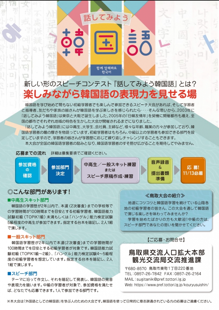 山陰で韓国語を学んでいる人たちの日頃の学習の成果を発表する大会。韓国語を母国語としない初級・中級者向けの大会で、中高生の部と一般の部では2人1組で韓国語のスキットを披露、1人で参加するスピーチ部門も設ける。