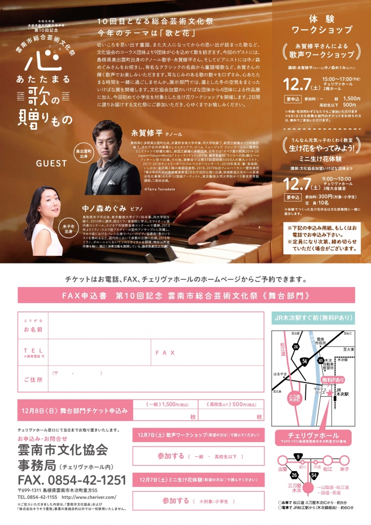 コーラスと生け花をテーマに行う文化の祭典が雲南市『チェリヴァホール』で開催。舞台部門では、奥出雲町出身のテノール歌手・糸賀修平氏、米子市出身のピアニスト・中ノ森めぐみさんを迎え、唱歌やピアノとの共演が行われる。また、雲南市文化協会加盟コーラス団体から9団体が参加し、司会は大坂愛を迎える。曲目は「鐘が鳴ります」「落葉松」「オー・ソレ・ミオ」「誰も寝てはならぬ」など。展示部門は12月7・8日に「雲南のいけばな展」を開催。雲南市文化協会加盟生け花団体から4団体が出瓶する。