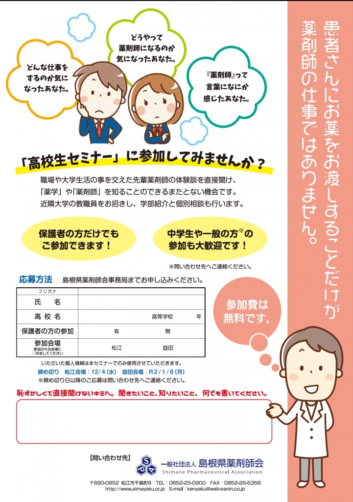 近年、薬剤師不足となっている島根県で、より多くの人に薬学について興味を持ってもらおうと、高校生を対象とした薬学についてのセミナーを開催。若手薬剤師による現在の仕事の紹介、薬学を目指す学生へのアドバイスを行うほか、近隣大学の薬学担当職員が学部について紹介。保護者だけの参加や中学生、一般の人も参加可能。