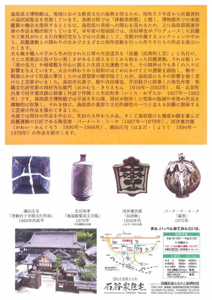 名もなき職人が作った日常の生活用具には美術品にも負けないくらいの美しさがあると唱えた「民藝運動」。その活動家にして鳥取市出身の染色作家・岡村吉右衛門の作品を中心に、現北条町出身で河井寛次郎を師事した陶芸家・生田和孝の作品などを紹介する。