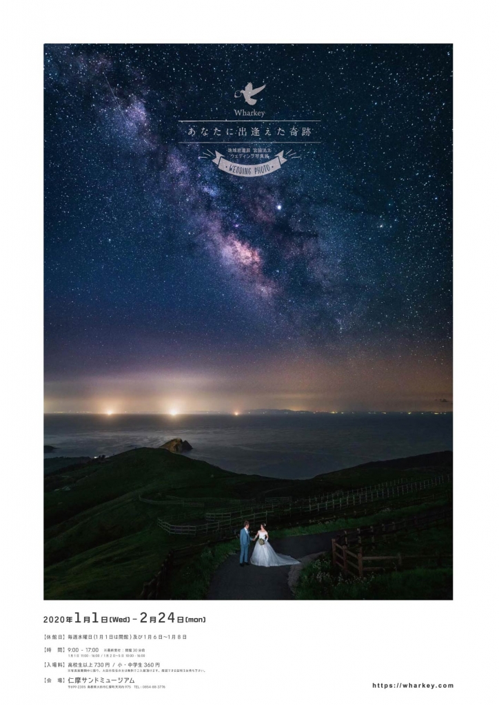 島根県大田市出身のウェディングフォトグラファー・宮脇洸太さん(HP)による写真展。宮脇さんは約2万人のウェディング関係者からの投票で決まる国内最大のウェディングフォトコンテスト「ジャパン・ウェディングフォト・グランプリ2019」で最高位のグランプリを獲得した実力派。受賞した作品は「二人の世界」という星空とウェディングがコラボした作品となっており、実際に大田市で撮影したもの。今回の写真展では星空ウェディングや婚礼前撮りをメインに結婚式関連・家族写真などを合計で約100作品以上展示予定。グランプリ作品以外にも、これまで国内外で受賞した5作品も展示する。