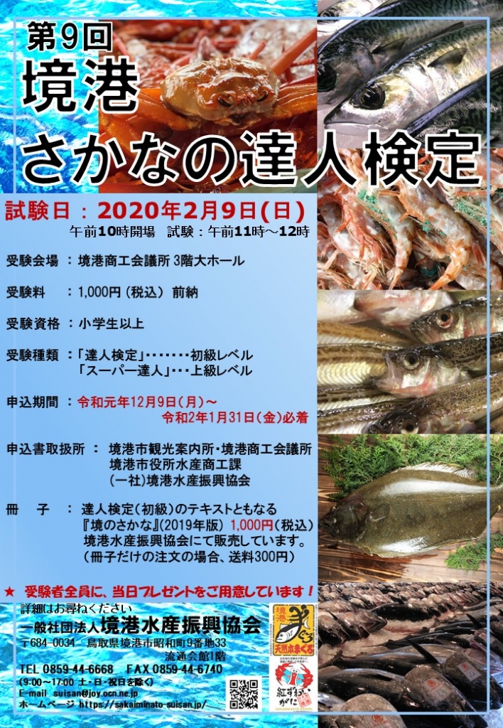 日本有数の水揚げ量を誇る鳥取県の境港のお魚や水産業についての知識を問う検定。試験内容は、初級レベルの「達人検定」と上級レベルの「スーパー達人検定」の2種類あり、お魚に興味のある子どもから、水産業に携わる知識豊富なプロまで、誰でも受験可能。参加者全員にプレゼントも用意。